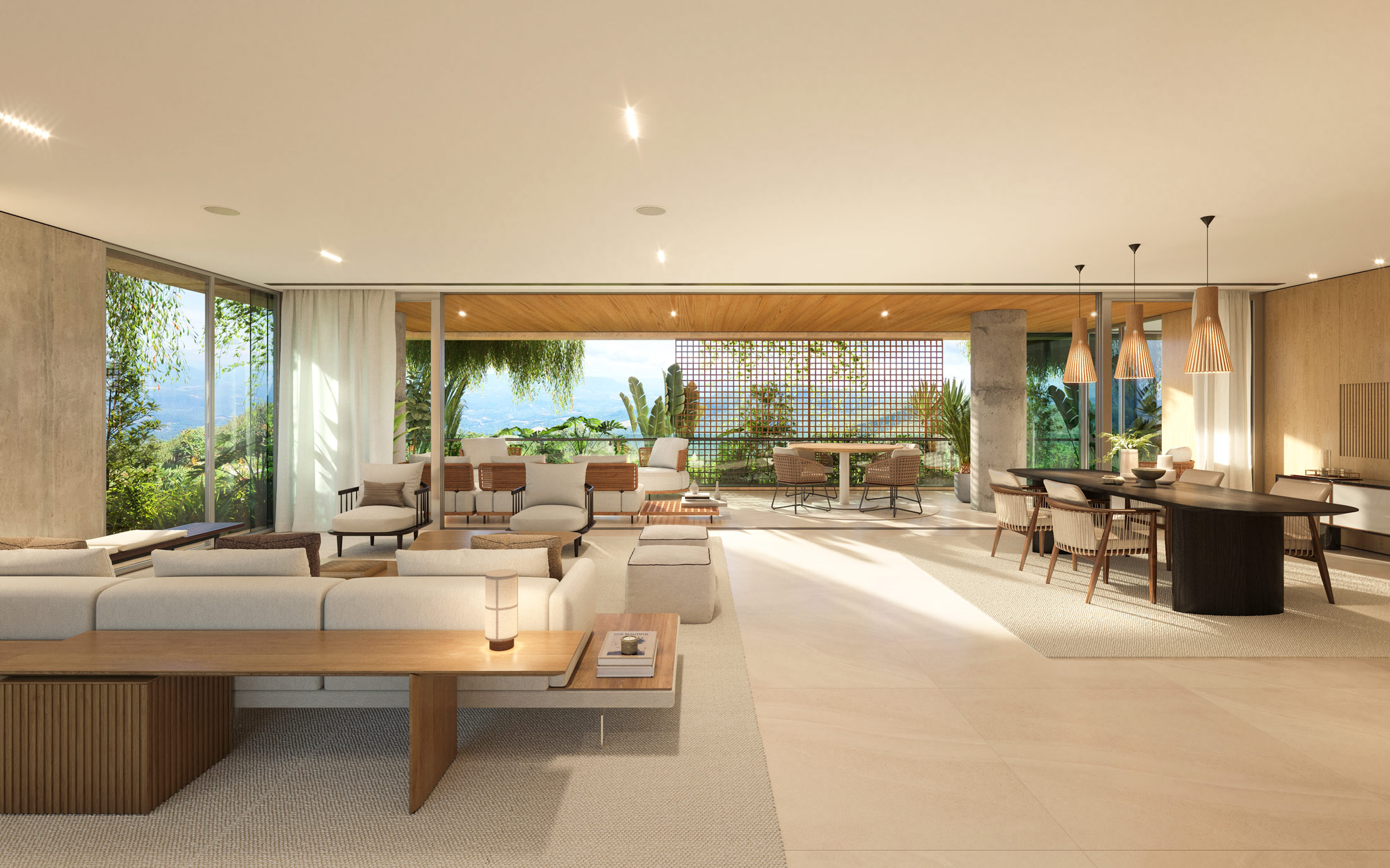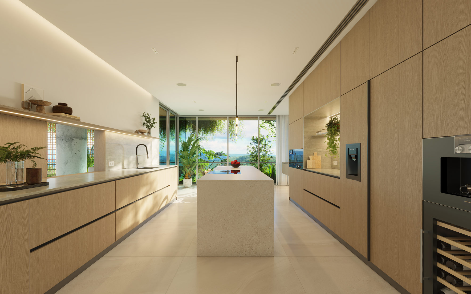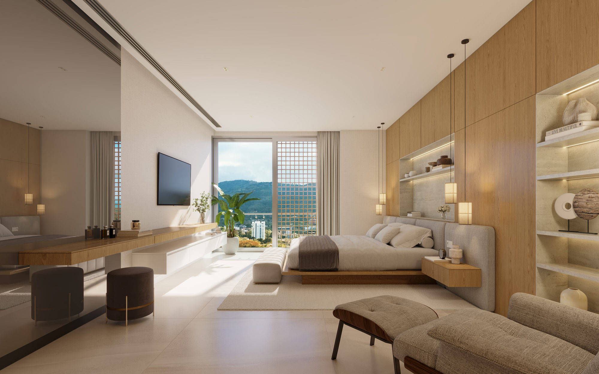 The most striking feature of the apartment is how the connection between the interior and exterior has been achieved. The panoramic views become a perfect canvas that brings beauty and serenity to the interior space. Además, el uso de la madera como elemento unificador crea un flujo natural entre los espacios interiores y exteriores.