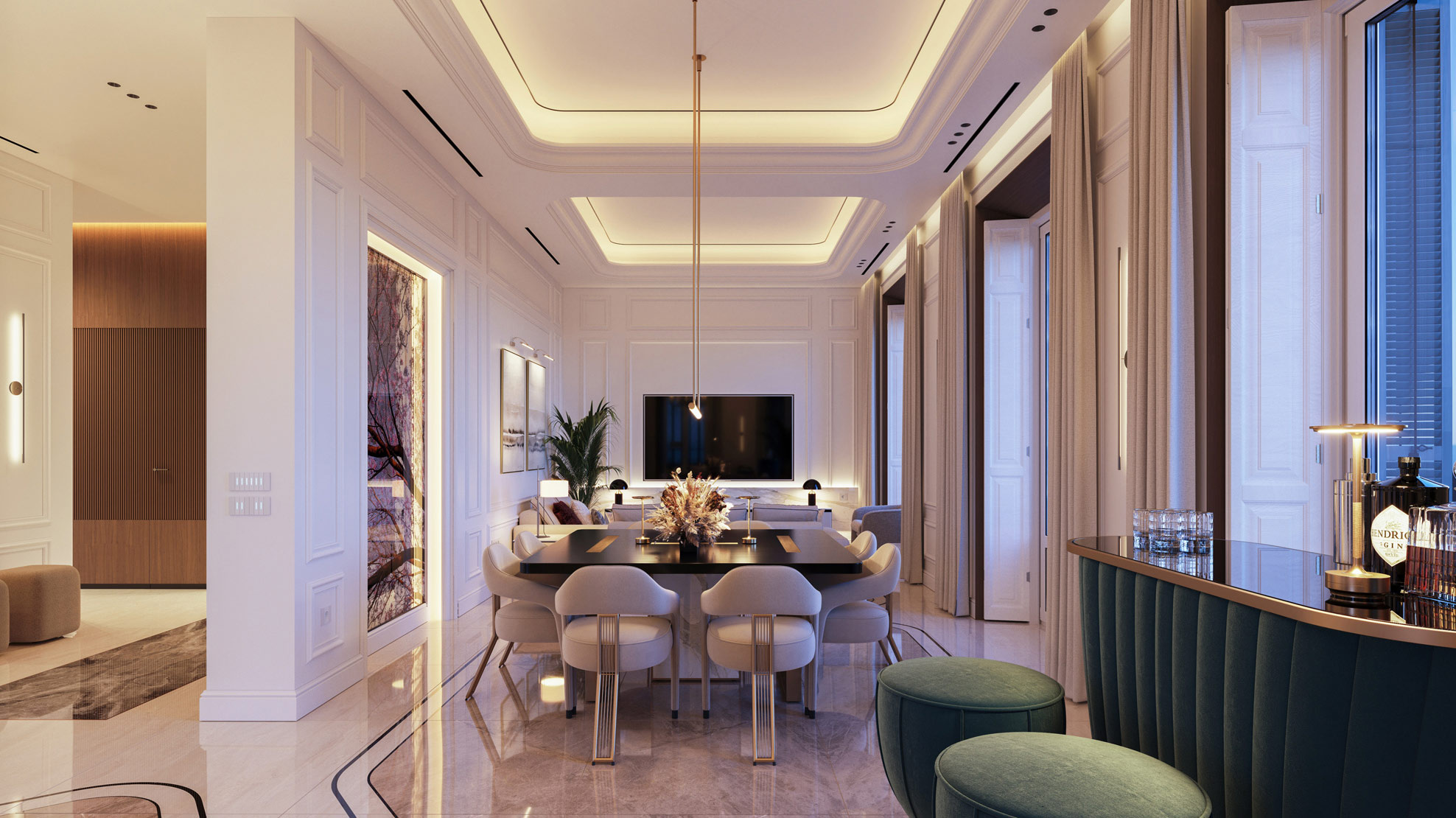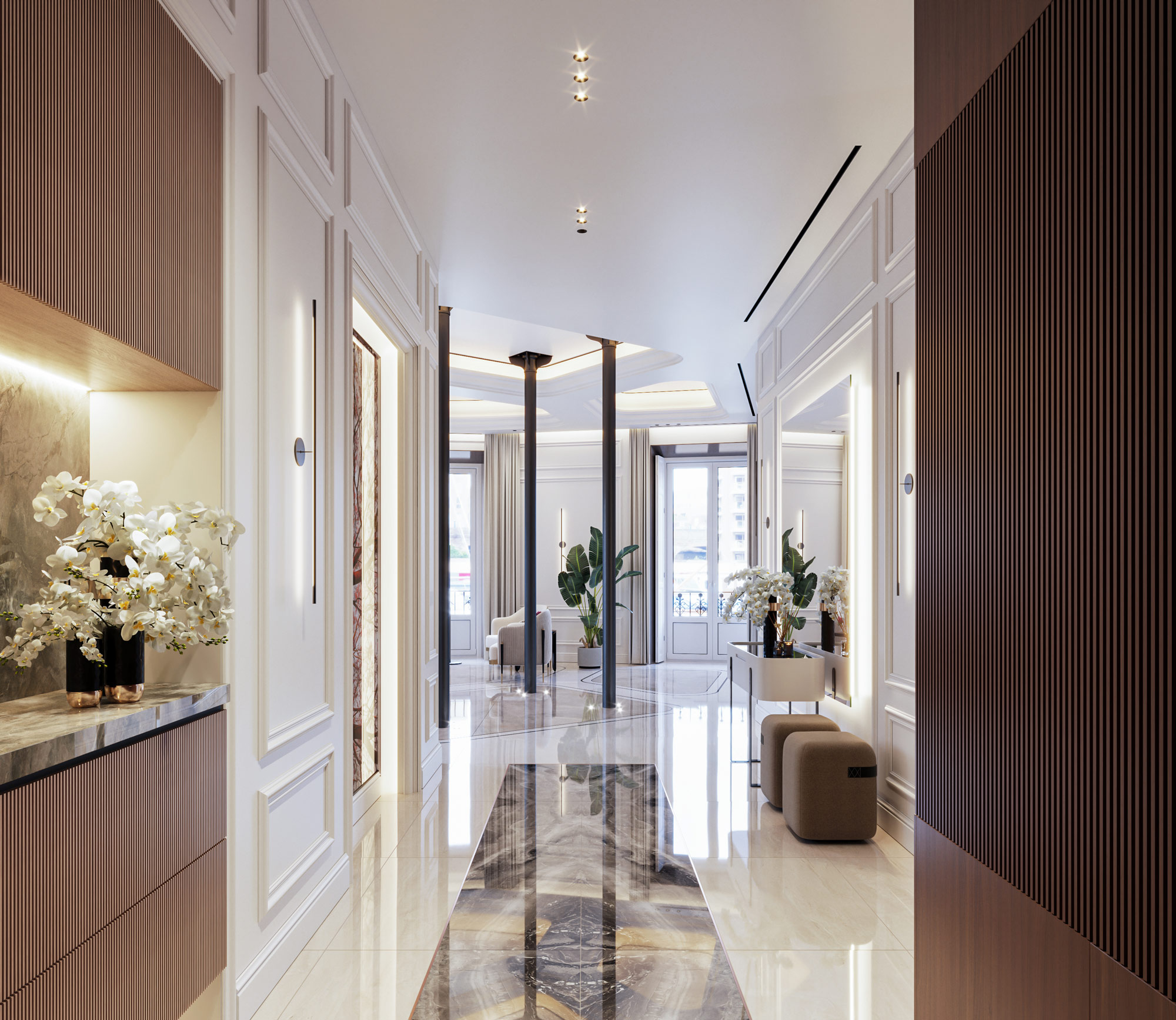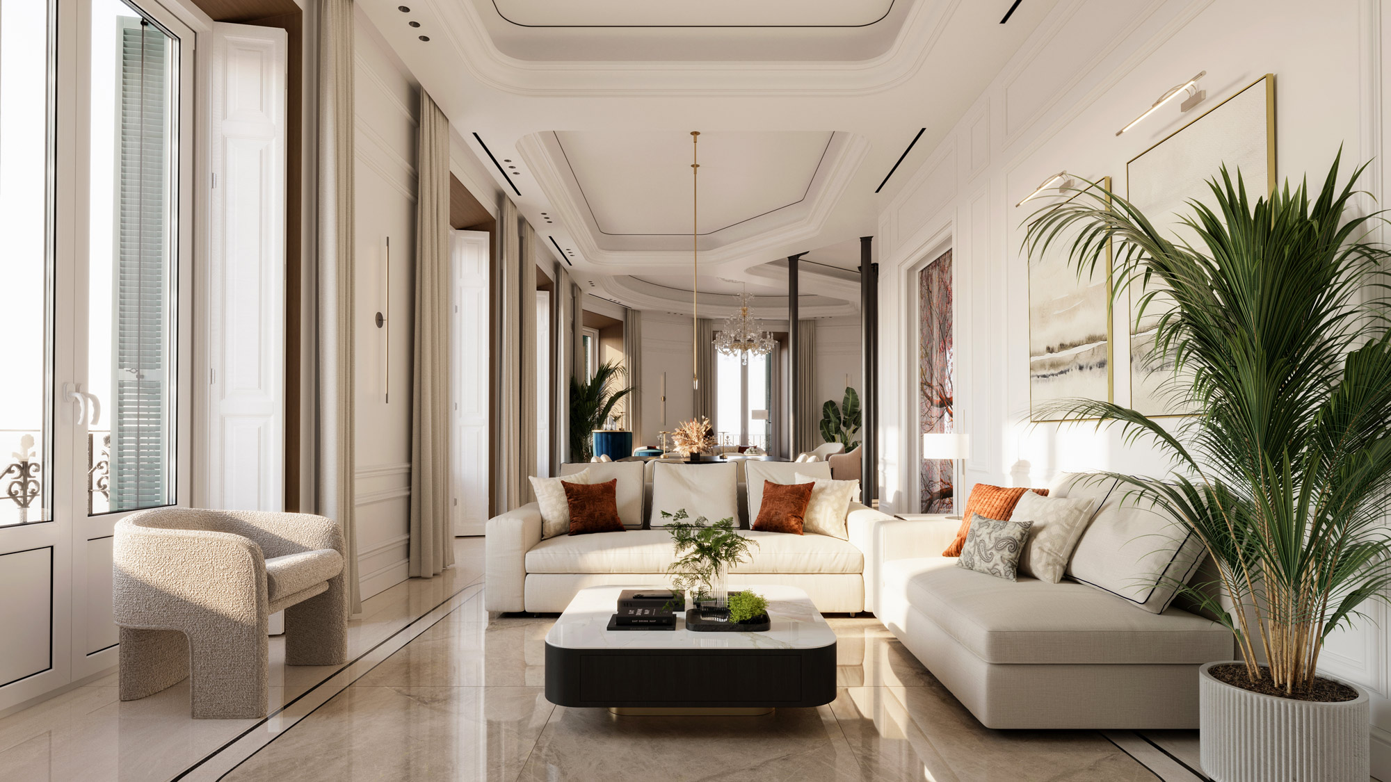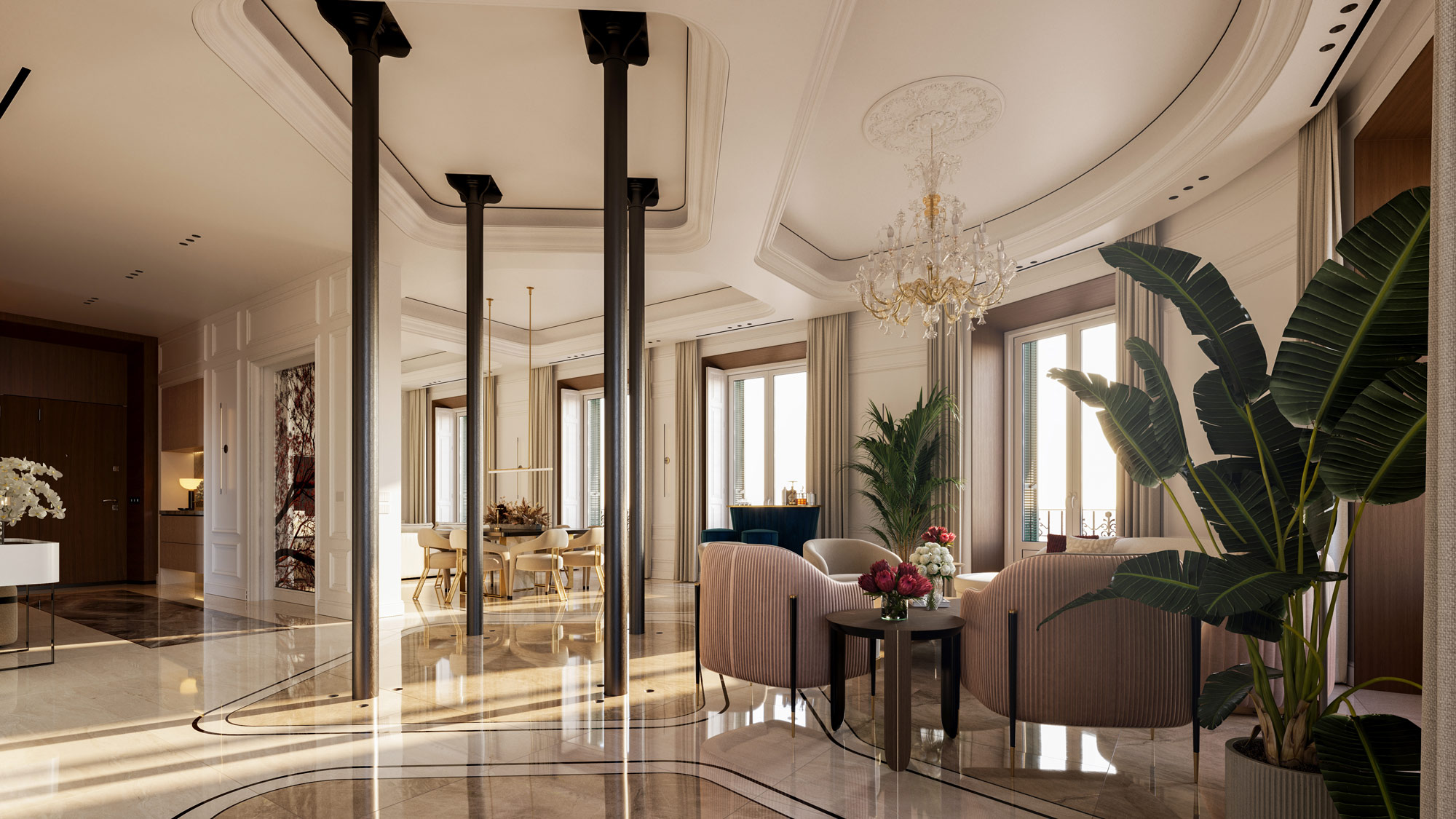 Cada mueble ha sido cuidadosamente seleccionado para ofrecer la máxima calidad y estilo. El mobiliario de alta gama de marcas de renombre se integra armoniosamente con elementos de diseño propio, creando un ambiente exclusivo y personalizado. La combinación de lo clásico y lo moderno resalta la elegancia atemporal que refleja la esencia del edificio.