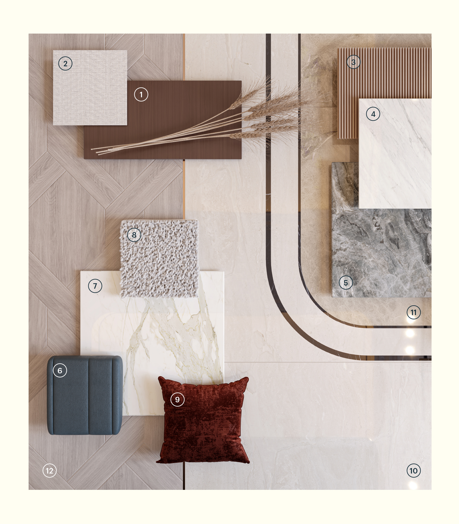 1. Madera de nogal 2. Vinilo. VESCOM 3. Madera de roble natural en lamas de 5x5 4. Porcelánico Glem White. Porcelanosa 5. Porcelánico Orobico Grey. Porcelanosa 6. Cuero sintético azul 7. Porcelánico Calacatta Gold. Cooking Surface 8. Alfombra de interior de lana tejida a mano 9. Terciopelo burdeos 10. Mármol beige natural 11. Mármol Niza crema natural 12. Suelo vinílico con efecto madera. Amtico.