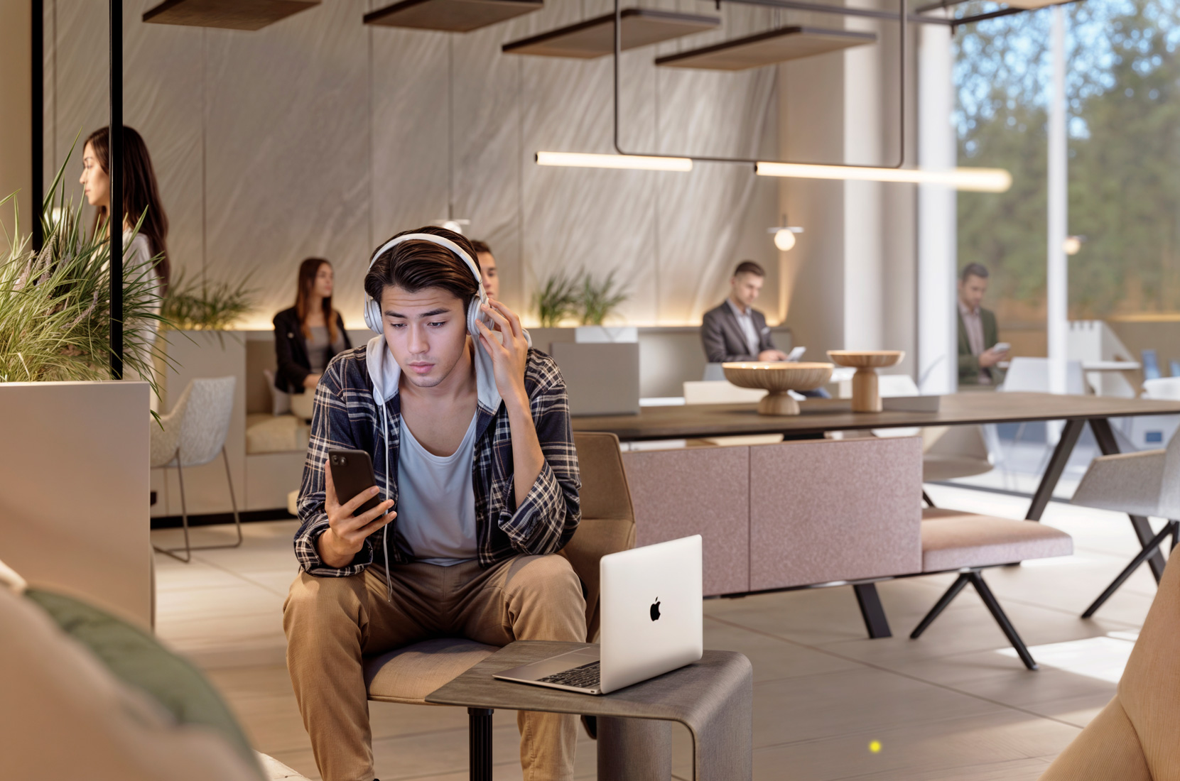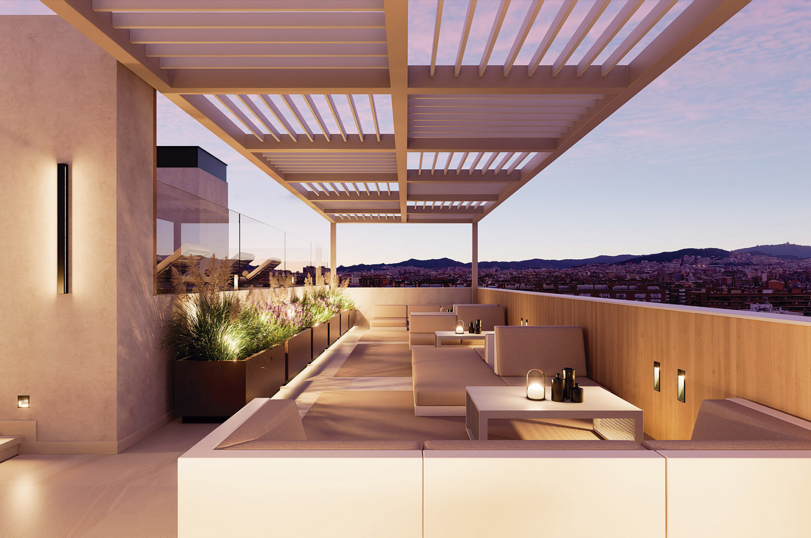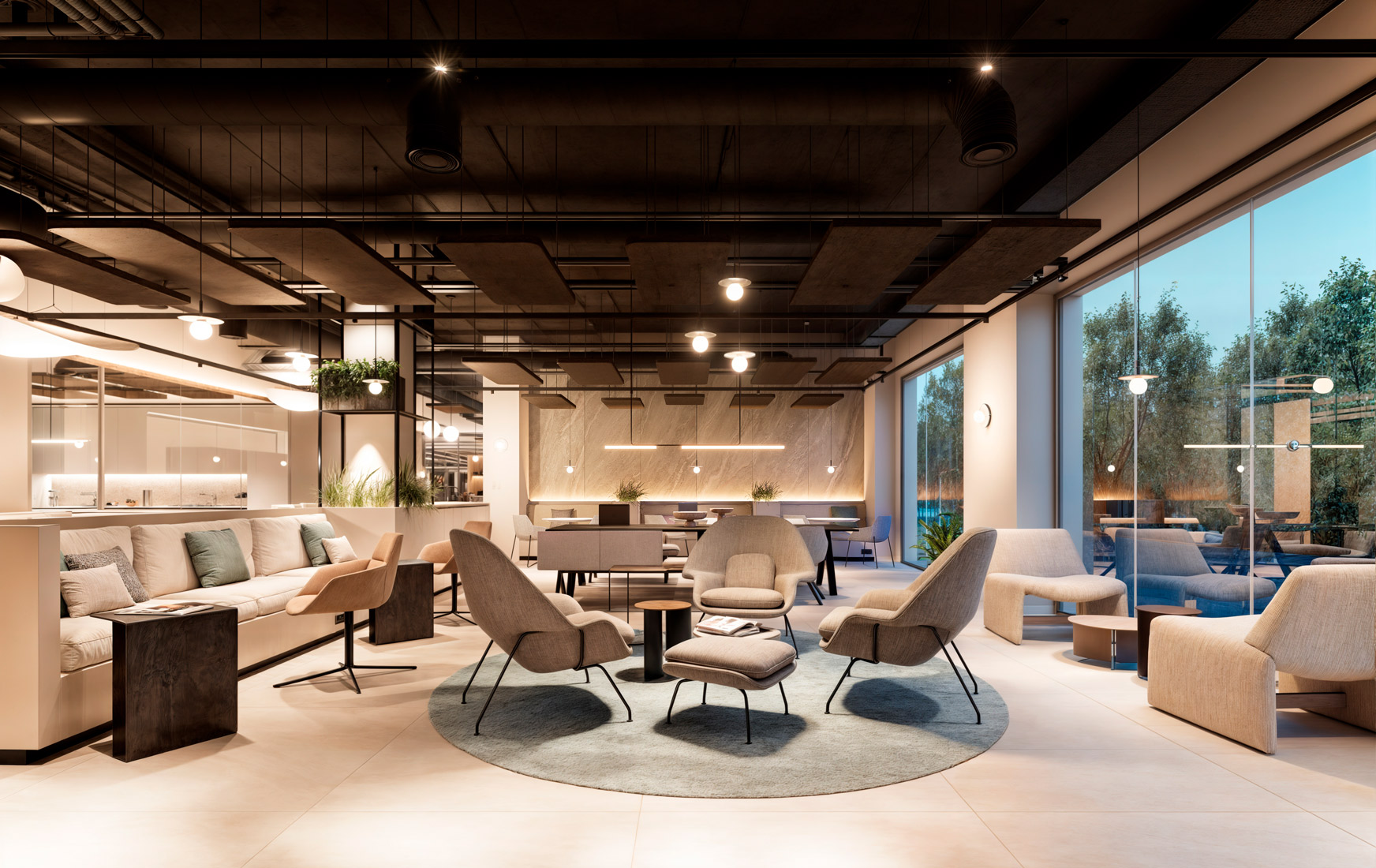 El diseño de interiores se basa en materiales nobles, tonos neutros y una iluminación cálida que realza la luz mediterránea. El vestíbulo, los salones y las zonas de coworking se conciben como extensiones del hogar, fomentando la conexión y la serenidad a través de un diseño elegante y equilibrado.