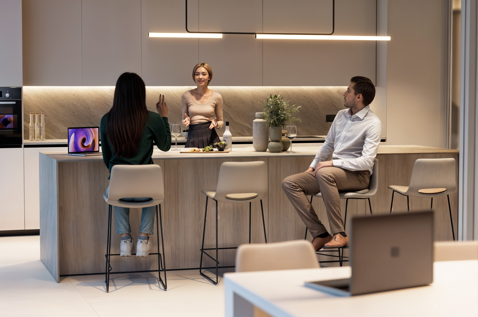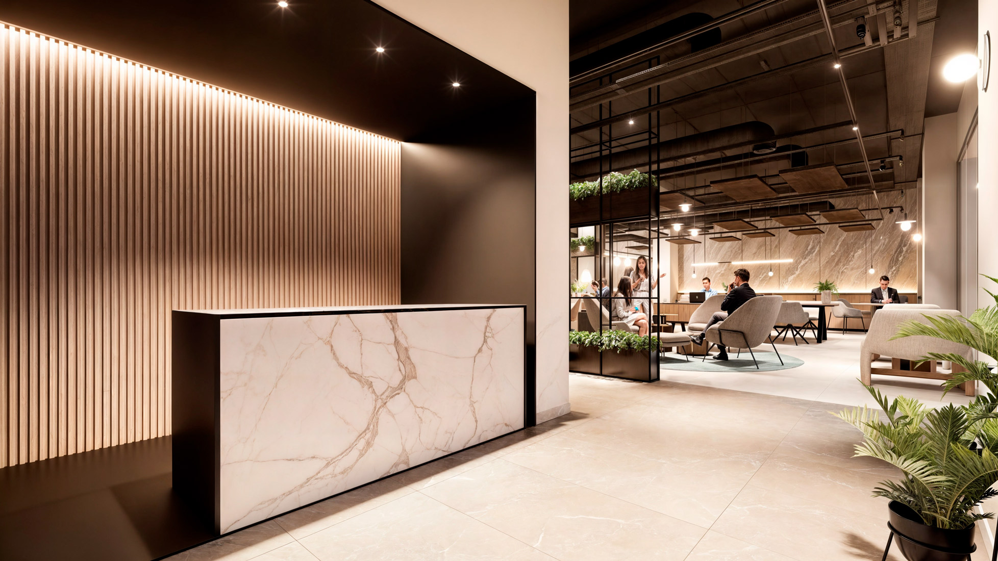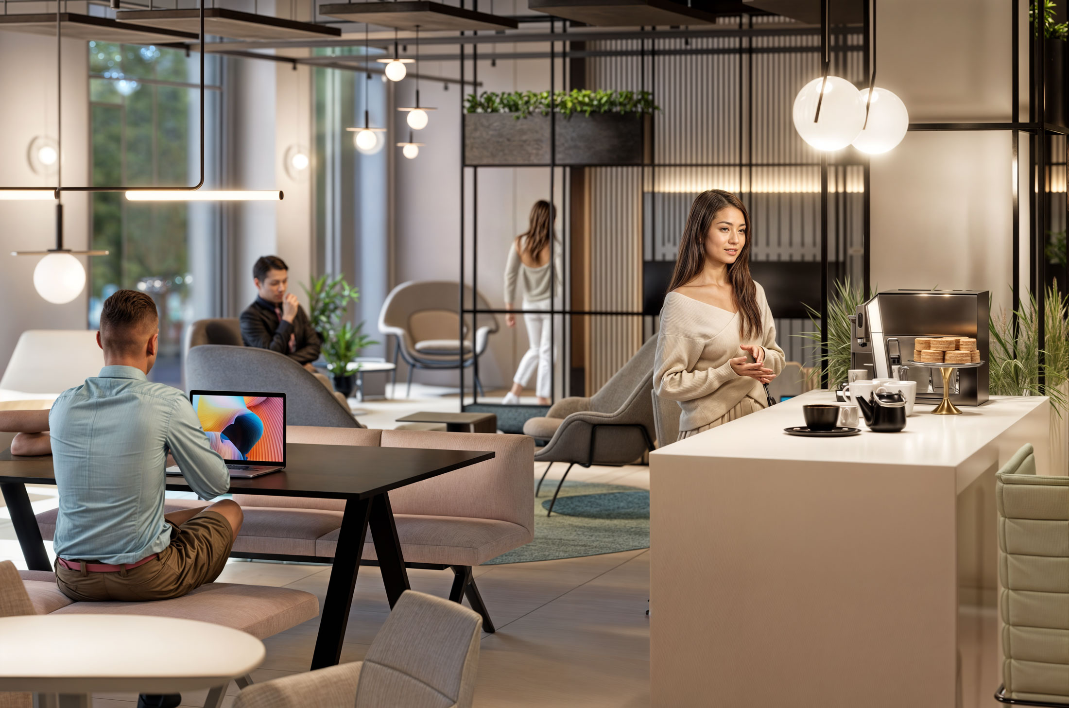 Más allá de simples espacios de paso, las zonas comunes se convierten en lugares de encuentro. El Kitchen Club, las salas de reuniones y las zonas de convivencia están diseñadas para fomentar el espíritu de comunidad y el bienestar, reflejando la filosofía de Aguirre & Berlanga: crear espacios que inspiren y mejoren la vida cotidiana.